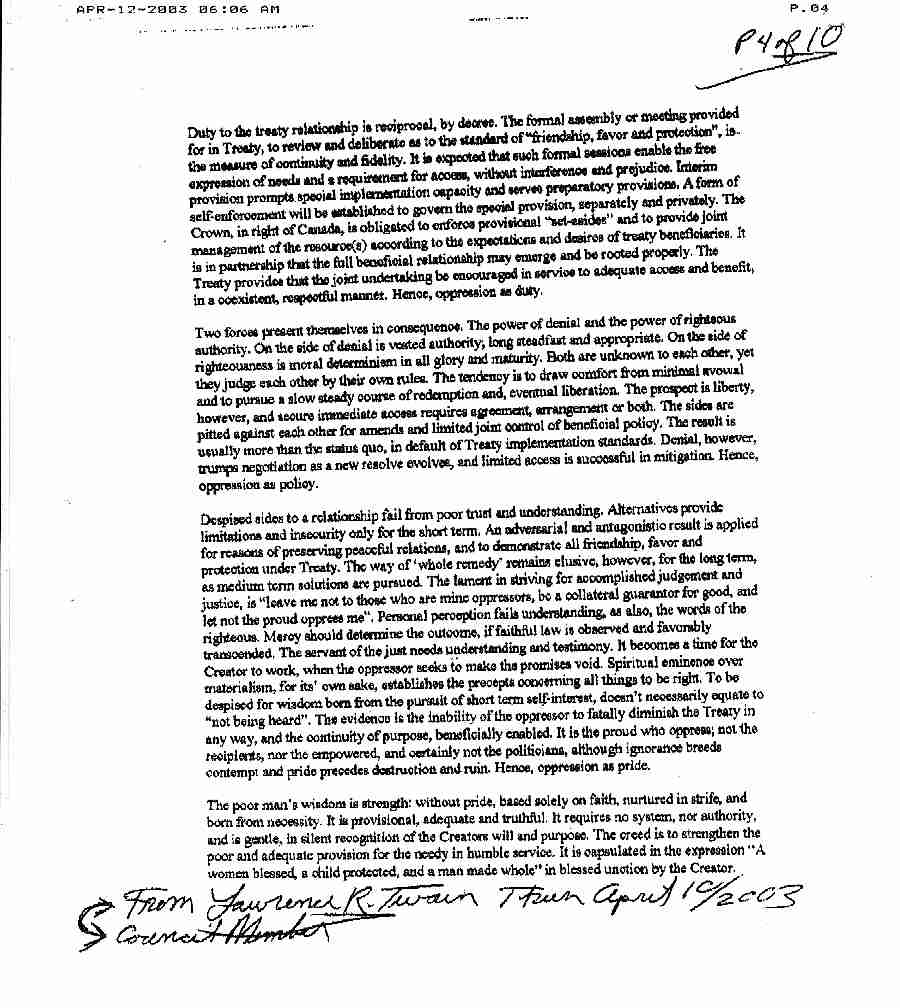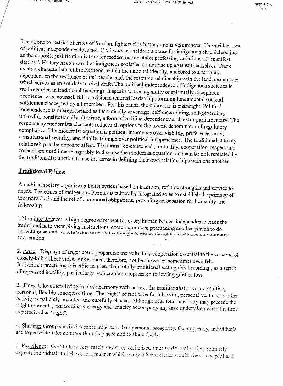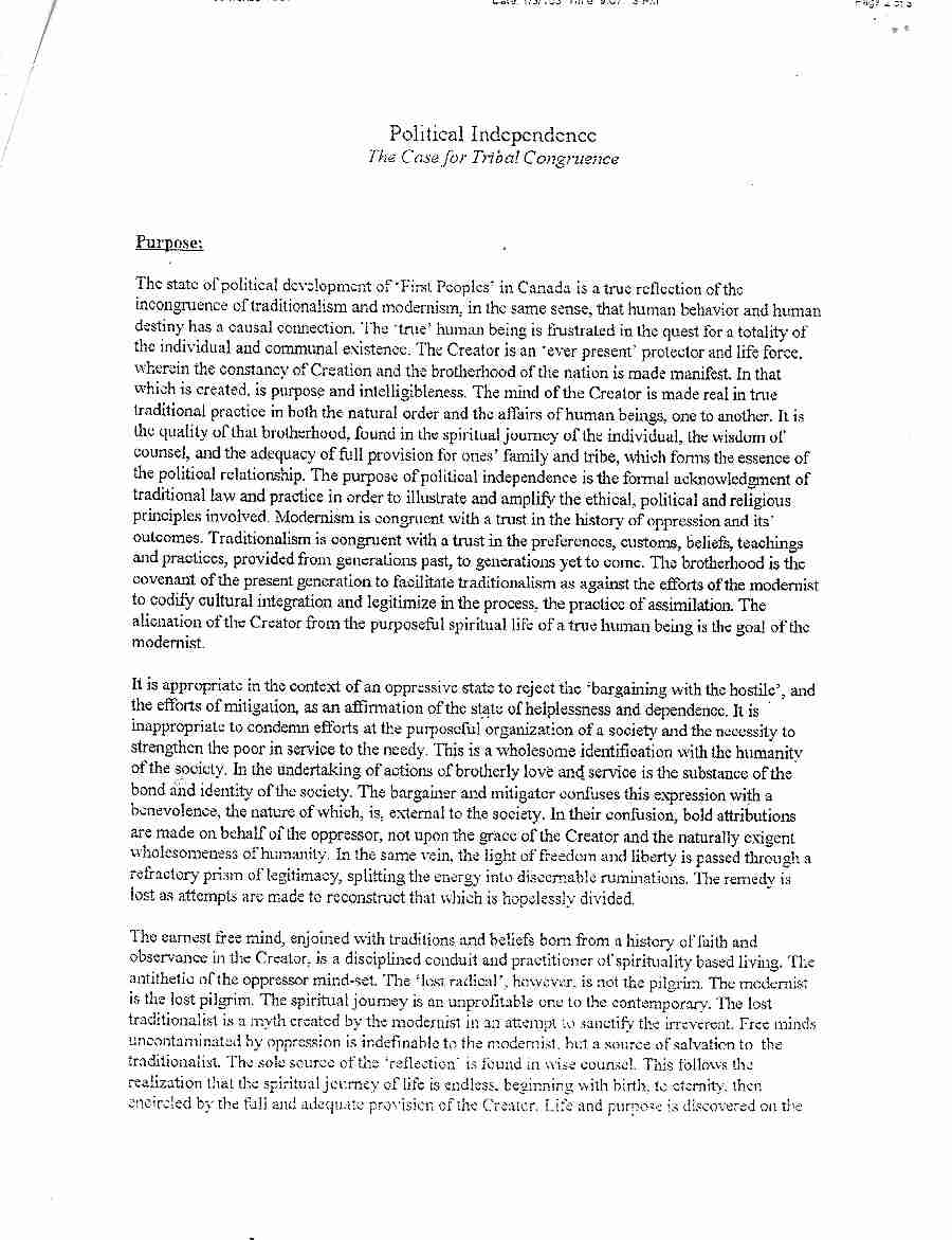INDIAN NATION OF NORTH AMERICA. The INDIAN NATION OF NORTH AMERICA was re-established in July 1945 and in 1991 to register Indian/Native persons, and to provide notice of Aboriginal RIGHTS and PRIVILEGES guaranteed to every Indian/Native person of North America. Granted to INDIAN, INUIT, METIS persons and those naturalized to live under the tutelage of sovereign Indian Nations and Governments. 1. The right to explore whole of North America territory as hunter, fisherman or trapper; to camp where it is convinient without causing any damage to the land or occupants. 2. To be exempt from personal income or corporate or government taxes enforced by the federal, provincial, state or municipal governments established. 3. To be exempt from military service or draft for compulsory service in any war or military or police action waged by any Commonwealth or North American government. 4. To purchase and use a railway ticket or other government owned transport at half price the rate allowed; and to pass all borders and tolls (free) between and within Canada and/or the United States. 5. To receive health, medical and education services to the extent of need and talent, services to be provided and/or fully paid by respective governments. |