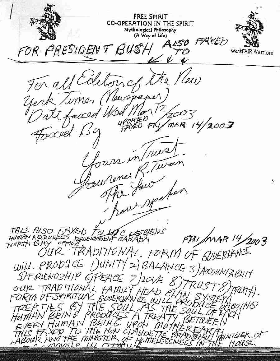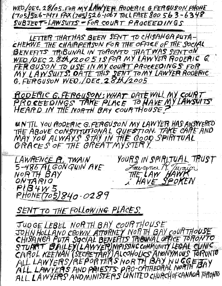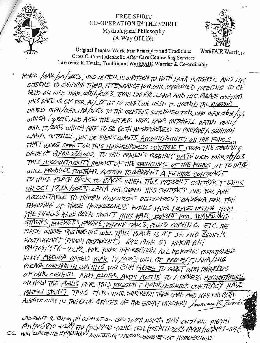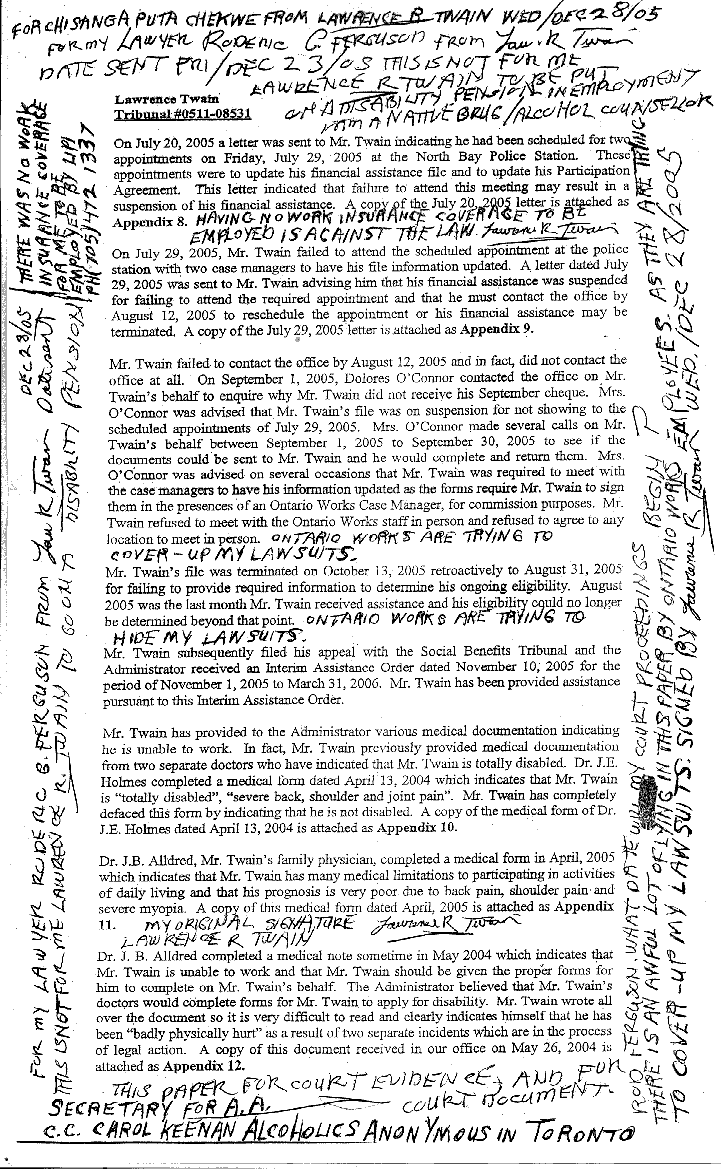 Accident on january 2nd, 2003, while being employedA lawsuit against Lawrence Twain's employer - LIPI ( the Low Income People Involvement of North Bay) regarding slip and fall accident while being employed by LIPI and travelling on the city bus in North Bay. View scans of documents.L.Twain's contract was 78-weeks job creation contract that was provided by the North Bay Human Resources Development Canada (HRDC). Lawrence Twain explains that this contract was to address the root causes that cause homelessness. The root causes that cause homelessness are : 1. The illness of alcoholism. 2. The illness of street drugs. 3. The abuse of prescription drugs that intern causes mental illnesses. |